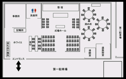 駐車場からお車を降りると正面がエントランスです。 ホワイエの奥に記帳所がございます。受付を通り式場内へ。ここまでの移動は最小です。 隣のお清め所までを一切の段差のない平面的構成を実現した近代式場。 ご高齢のお客様に対しても「やさしさ」を一番に考えた明るいセレモニーホールです。